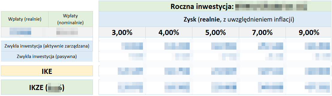 - porównanie zwykłej inwestycji, inwestycji w formie IKE, inwestycji w formie IKZE (dla wskazanego w ankiecie progu podatkowego)